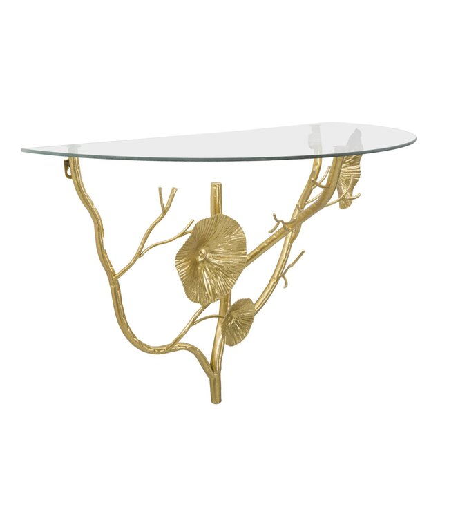 Bedkast side tisty cm 60x30x40 is een opvallend decoratief object waarmee je moeiteloos een stijlvol accent aan je interieur toevoegt. Halfrond nachtkastje om op te hangen in verguld metaal versierd met takken en bladeren en met glazen blad.
