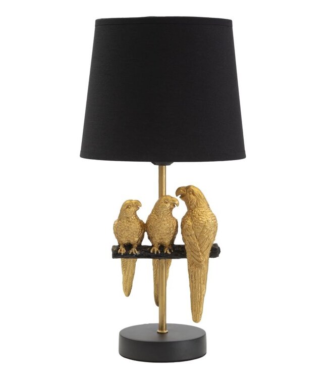 Bedlampje papegaaien cm ø 20x39 is een opvallend decoratief object waarmee je moeiteloos een stijlvol accent aan je interieur toevoegt. Gouden metalen bedlampje met zwarte stoffen lampenkap. de schacht is versierd met papegaaien. de combinatie van goud en zwart zorgt voor een perfect contrast dat geschikt is voor elke kamer.