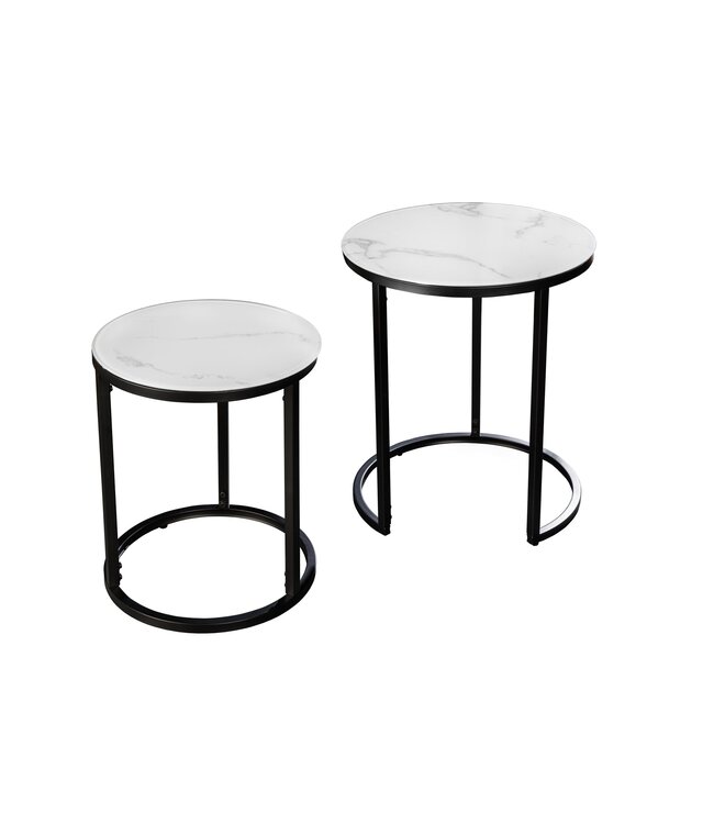 Bijzettafel ELEGANCE Ø 50-60cm rond set van 2 marmerlook wit met zwart frame