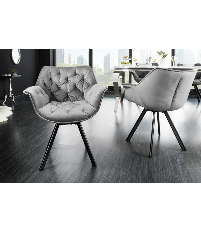 Als u op zoek bent naar een bijzonder comfortabele stoel met een 180° draaifunctie, moet u nu eens goed kijken. Onze comfortabele retro-klassieker met extra dikke vulling en decoratieve knopen op de zitting en rugleuning overtuigt door zijn tijdloze en trendy design. De zwart metalen poten vormen een mooi contrast met de zitschaal met glanzend grijs fluweel. Neem plaats en ervaar hoe elk samenzijn met het gezin een waar genot wordt!