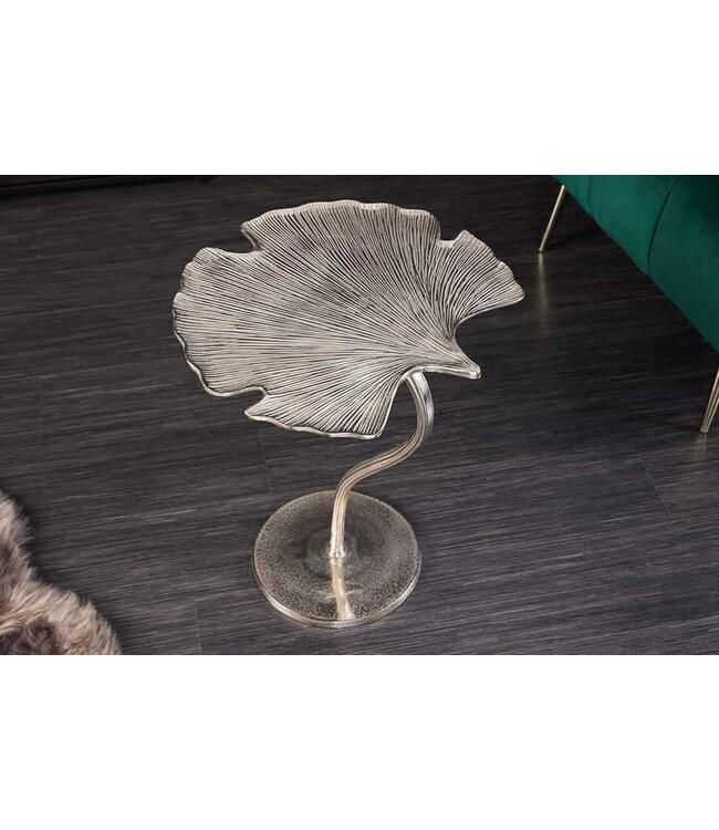 Deze delicate tafel betovert op het eerste gezicht! Het zilveren tafelblad is gemodelleerd naar een ginkgoblad. De golvende randen, de karakteristieke inkepingen en de bladnerven aan de bovenzijde onderstrepen perfect de authentieke uitstraling van het blad. Het unieke tafelblad wordt ondersteund door een gebogen frame met ronde voet, wat stabiliteit op elke ondergrond garandeert.
