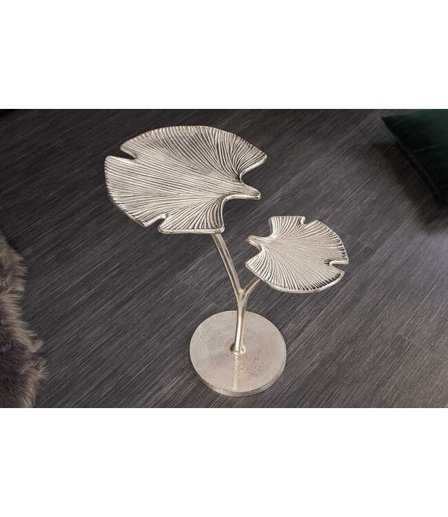 Deze delicate tafel betovert op het eerste gezicht! De zilveren tafelbladen zijn gemodelleerd naar ginkgobladeren en hun gelaagde opstelling imiteert een kleine tak. De golvende randen, de karakteristieke inkepingen en de bladnerven aan de bovenzijde onderstrepen perfect de authentieke uitstraling van het blad. Het unieke tafelblad wordt ondersteund door een gebogen frame met ronde voet , wat stabiliteit op elke ondergrond garandeert.