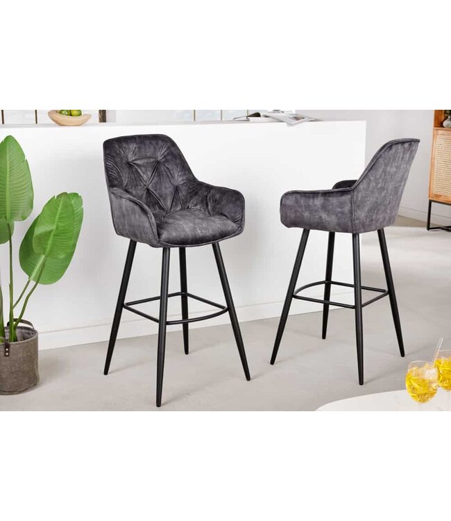 Deze smaakvolle barkruk voegt stijl en klasse toe aan uw thuisbar. De barstoel scoort met zijn comfortabele en hoogwaardige fluwelen bekleding en maakt tegelijkertijd indruk met zijn pompeuze Chesterfield-stiksels . De armleuningen zorgen voor extra comfort en ronden het design van de barkruk vakkundig af. Beleef gezellige uren met uw nieuwe, gestoffeerde fluwelen barkruk met rugleuning !
