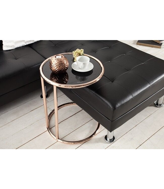 De design bijzettafel ART DECO verwijst naar een speels en glamoureus kunsttijdperk en is daarmee een eyecatcher in iedere woon- en studeerkamer. De contrasterende verbinding van het tafelblad van glanzend zwart glas met het koperkleurige frame resulteert in een nieuwe editie van een klassieker die je universeel kunt integreren in vele klassieke tot moderne inrichtingsstijlen.