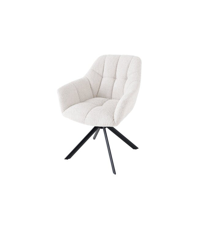 De PAPILLON draaistoel in luxe witte bouclé biedt een perfecte combinatie van comfort en stijl. Met een strak zwart frame en een soepele 180° draaibeweging is deze stoel ideaal om te ontspannen, werken of gewoon om gezellig te zitten.