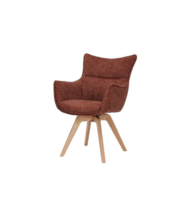 De stoel is uitgevoerd in een stijlvolle roestbruine kleur, terwijl de poten in een naturel eikenhout tint zijn.