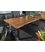 Pas na een lange droogperiode wordt de bast verwijderd, waarna de randen in een complex proces fijn worden geschuurd, gelakt en oppervlakteverzegeld. Zo kunt u zorgeloos genieten van een avondje tafelen met vrienden en familie aan deze eettafel. Als laatste stap ondergaat het 6 cm dikke tafelblad een grondige kwaliteitscontrole en worden eventuele oneffenheden met de hand geschuurd en gepolijst. De eettafel wordt ondersteund door twee massieve roestvrijstalen geleiders, die een modern contrast vormen met het houten tafelblad en de tafel een vleugje industrieel design geven.