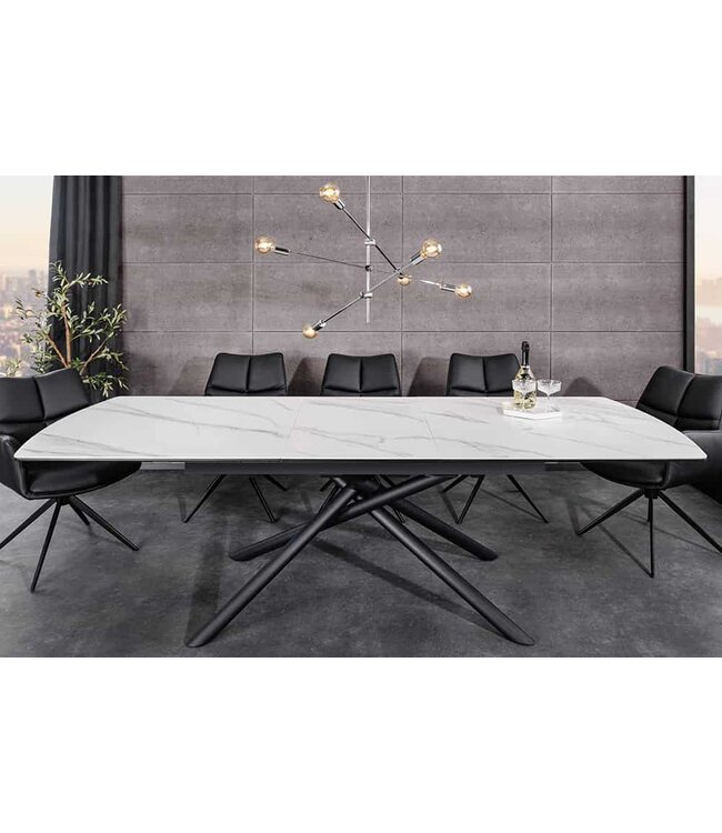 De MIKADO design eettafel brengt een warme en uitnodigende sfeer in huis met zijn edele keramische tafelblad in marmeren design in stijlvol wit. Het elegante oppervlak straalt hoge kwaliteit uit en wordt perfect aangevuld door het opvallende sterframe in matzwart. Een tafel die niet alleen visueel indruk maakt, maar ook uitnodigt tot een gezellig samenzijn.
