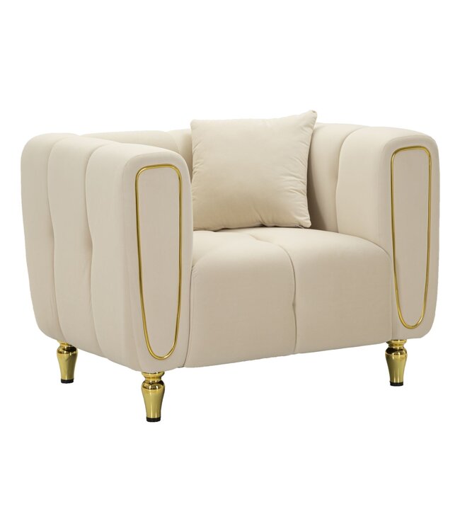 Fauteuil alma crème met kussen cm 97x81x71 is een opvallend decoratief object waarmee je moeiteloos een stijlvol accent aan je interieur toevoegt. Crèmekleurige fauteuil met gouden poten om in elkaar te zetten, bekleed met gewatteerd fluweel. ideaal voor moderne en verfijnde omgevingen, het voegt een vleugje luxe en comfort toe.