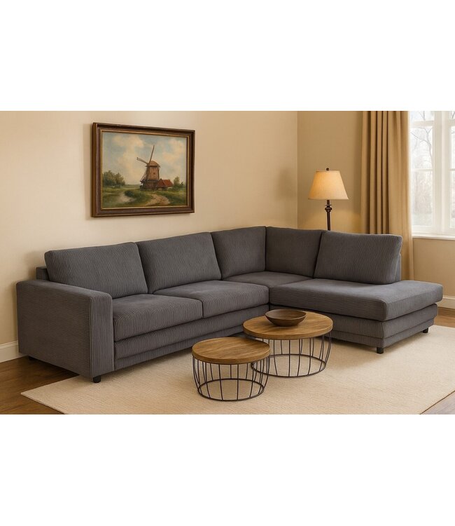 De hoekbank Girona is een stijlvolle en comfortabele 2,5-zits hoekbank die perfect past in een modern of industrieel interieur. De kenmerkende ribstof geeft de bank een warme, luxe uitstraling en zorgt tegelijkertijd voor een zachte en comfortabele zit. Dankzij het strakke design en de compacte afmetingen is deze bank ideaal voor zowel kleinere als middelgrote woonruimtes.
