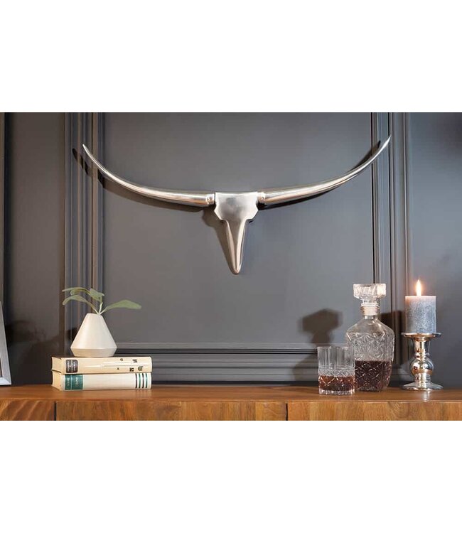 De koele elegantie van het hoogwaardige aluminium en het gebogen design van de hoorns laten de feestzaal, woonkamer en eetkamer in een geheel nieuwe sfeer schitteren. In de onlineshop van Riess-Ambiente vindt u de BULL wanddecoratie in andere maten.