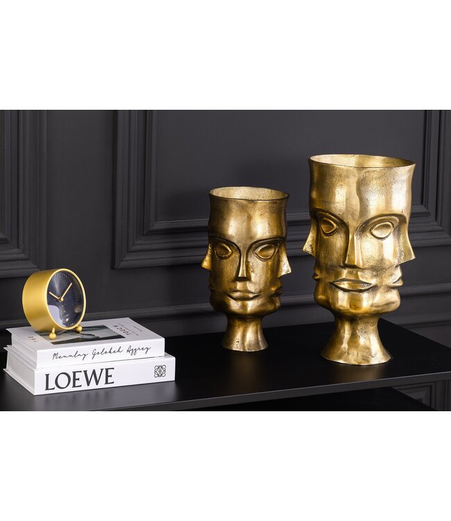 Het buitengewone ontwerp van de vazen, met artistieke gezichten gemaakt in de vorm van een Afrikaanse sculptuur, geeft uw kamer een moderne, maar tegelijkertijd tijdloze esthetiek. Of het nu gaat om een blikvanger op de eettafel, de plank of als stijlvolle toevoeging in de woonkamer - de handgemaakte set van 2 van messingkleurig metaal zorgt voor een uniek accent en zet bijzondere accenten in elke kamer. Koop deze speciale set en laat je inspireren door de creatieve ontwerptaal! Samen met andere gouden accessoires zullen de bloempotten een hoogtepunt van uw sfeer zijn!
