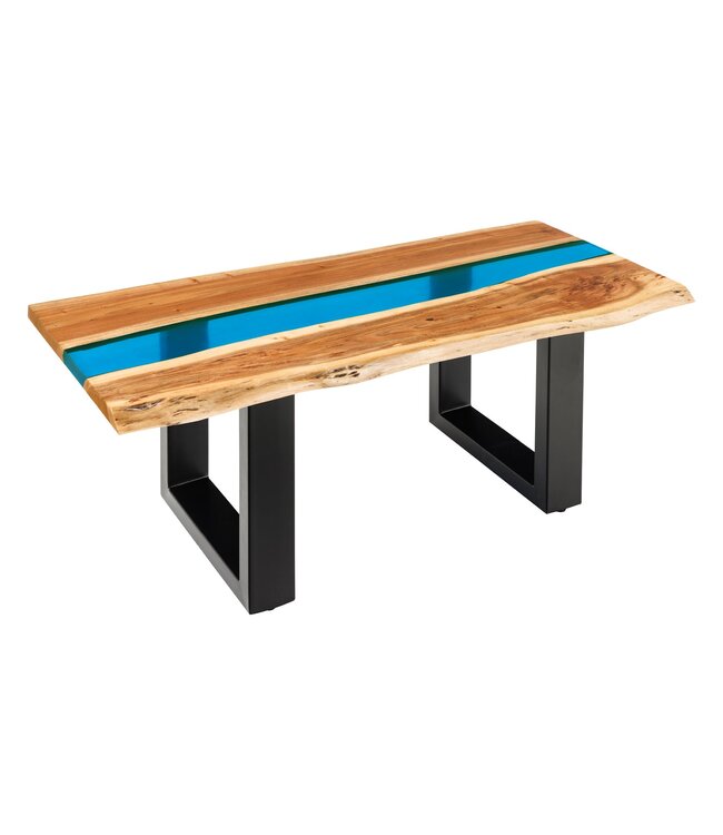 De tafel is vervaardigd uit acaciahout en heeft een gelakte, gepolijste afwerking. Het tafelblad is voorzien van een blauwe strip van epoxyhars, terwijl de poten zijn gemaakt van poedergecoat ijzer voor extra stabiliteit en duurzaamheid.