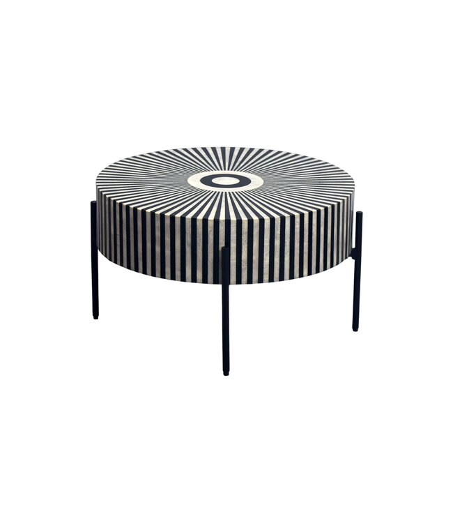 De tafel is gemaakt van een combinatie van bot/resin en ijzer, wat zorgt voor een robuuste en duurzame constructie. De poten zijn eveneens van ijzer, wat bijdraagt aan de stabiliteit van de tafel.