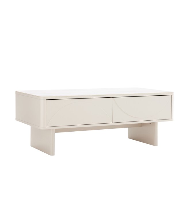 De salontafel is vervaardigd uit MDF met een keramisch blad en is afgewerkt met een vernislaag voor een duurzame en stijlvolle uitstraling.