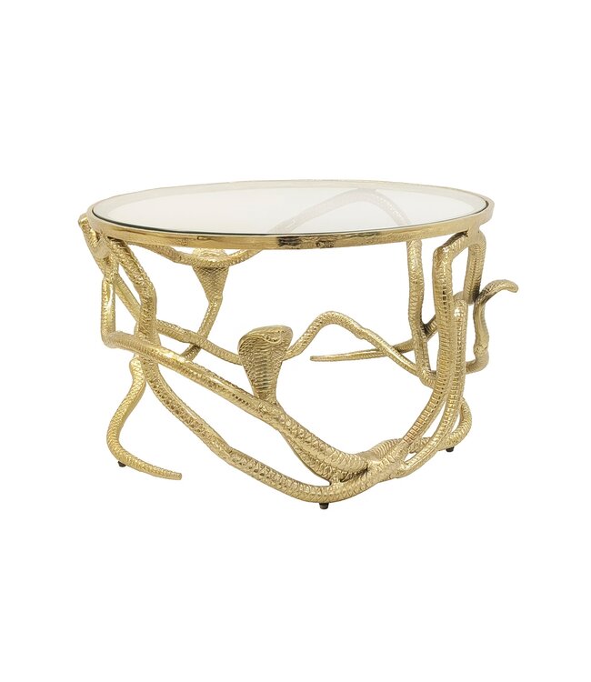 Voeg een vleugje elegantie toe aan uw interieur met de Salontafel SNAKE. Deze stijlvolle salontafel met een prachtig glazen blad en een gouden afwerking is de perfecte aanvulling voor elke woonkamer.