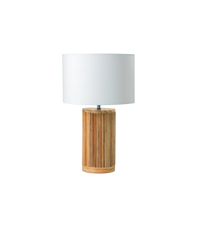 De lampenkap is uitgevoerd in een frisse witte kleur, terwijl de basis een natuurlijke houtafwerking heeft.