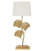 Tafellamp glamy cm ø 33x81 is een opvallend decoratief object waarmee je moeiteloos een stijlvol accent aan je interieur toevoegt. Gouden metalen tafellamp met witte stoffen kap. de basis van bladeren herinnert aan de natuur en het algehele ontwerp doet denken aan een plant.