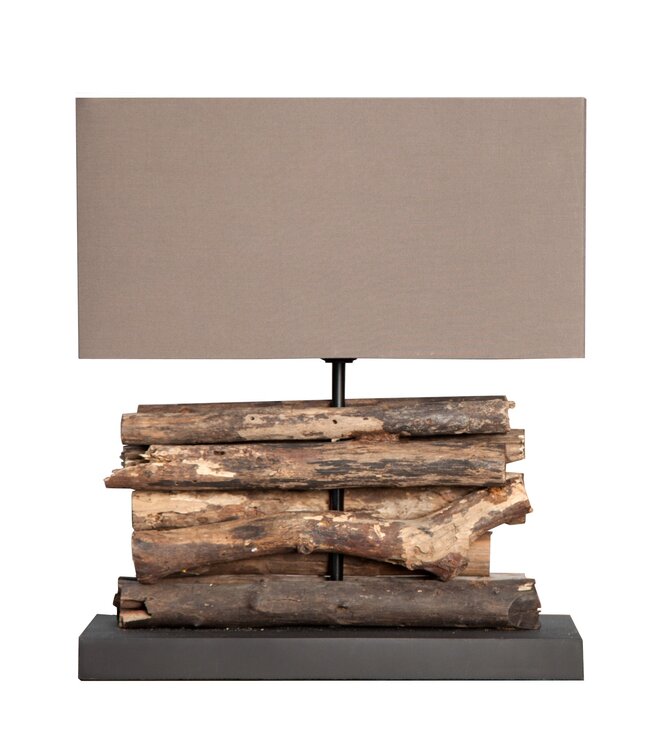 Drijfhoutbruin met een neutrale linnen lampenkap.