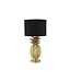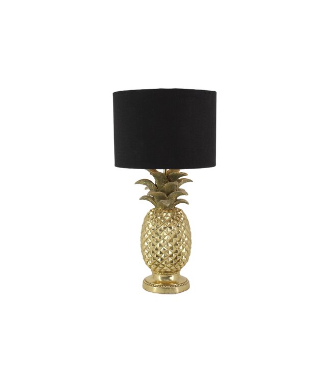Voeg een vleugje tropische luxe toe aan uw ruimte met de tafellamp PINEAPPLE, die een opvallend gouden polyresin frame en een chique zwart-gouden lampenkap heeft. Met zorg handgemaakt, brengt deze statement lamp speelse elegantie en een warme, uitnodigende gloed naar elk nachtkastje, bureau of bijzettafel.