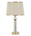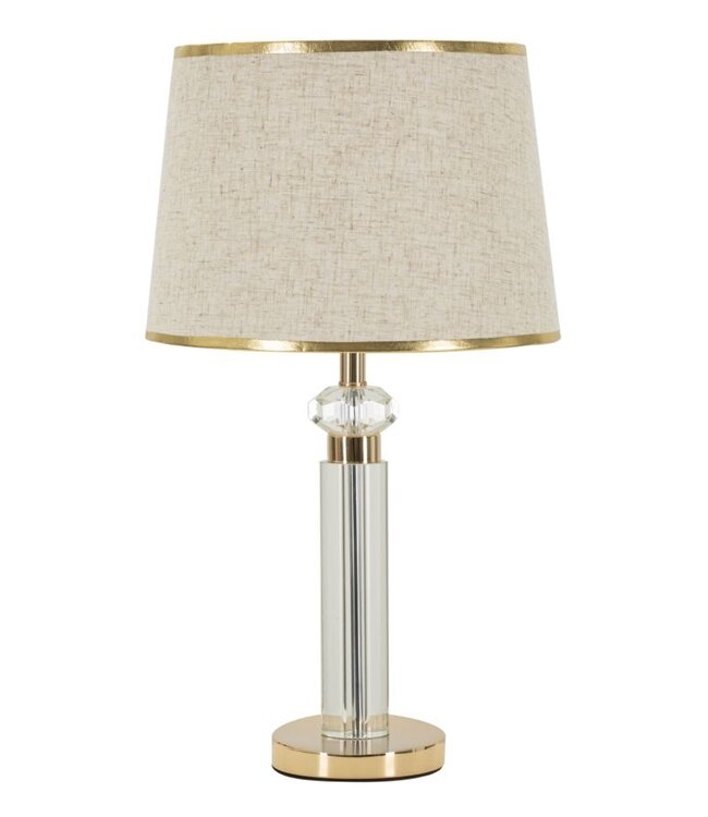 Tafellamp praga cm ø 30x52,5 is een opvallend decoratief object waarmee je moeiteloos een stijlvol accent aan je interieur toevoegt. Elegante gouden metalen tafellamp met transparante toepassingen. compleet met beige stoffen lampenkap met gouden bies.